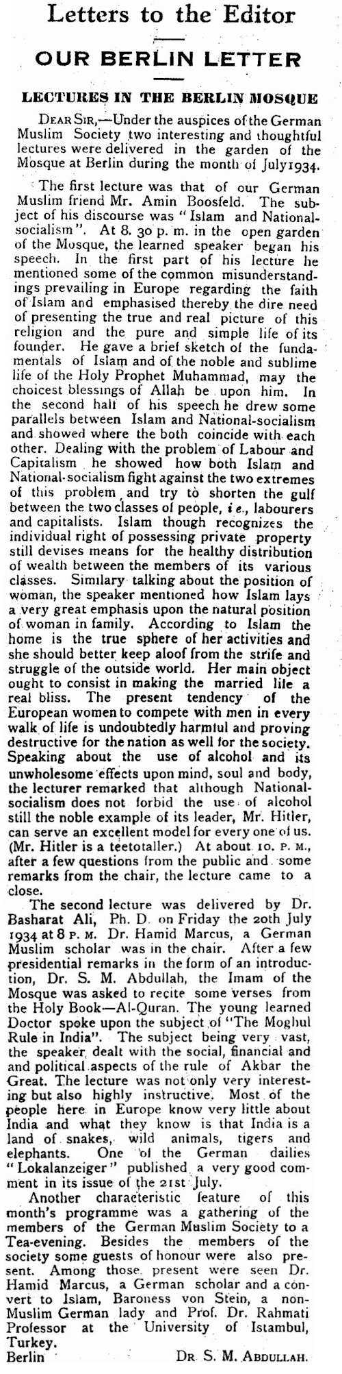 Displayed below is the image of a letter by the Imam of the Mosque (Dr S.M. Abdullah), published in The Light, August 24, 1934: